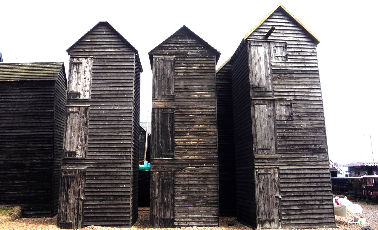 NET SHOPS - These The old town’s Net Shops - approximately 50 black wooden sheds standing in neat rows on a shingle beach are unique. They were built to provide weather-proof stores for fishing gear made of natural materials which rotted if wet for a long time. Today’s materials are artificial and can be left in the open. Most net shops stand on a piece of beach that appeared suddenly after the first of the town’s groynes were erected in 1834. The new beach area was small and close to the sea, so each shop could only have about eight or nine feet square to build on. But all boats had more nets than could be stored in such limited space, so the sheds had to grow upwards. Some have cellars. Many originally stood on posts to let the sea go underneath. Fishermen keep spare gear in the shops. One is a museum. The sheds were originally built on posts to allow the sea to go underneath, however more shingle has built up and the sea no longer reaches the huts. The limited space meant the sheds had to grow upwards. Some sheds have cellars.