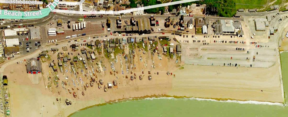 HASTINGS BEACH MAP - Another aerial view of the world's largest beach launched fishing fleet. What is strange, is that just a few hundred yards west, there are amusement arcades that are strangely out of keeping with the history of this part of Old Hastings. We put that down to confused marketing, and maybe difficulties of access by road. Thankfully, at least the maritime history is somehow surviving.