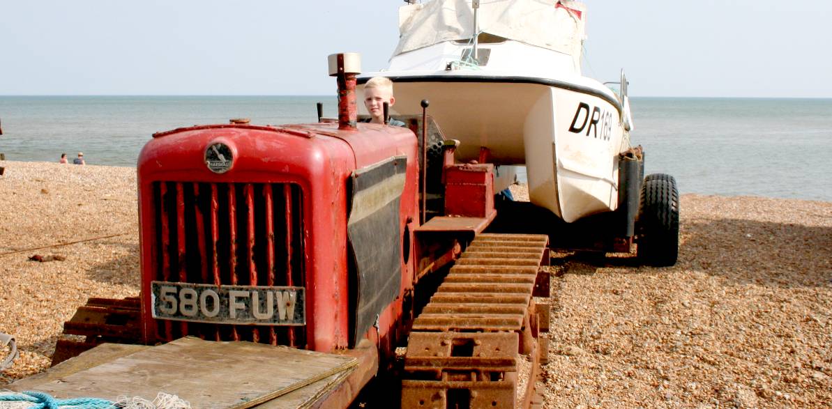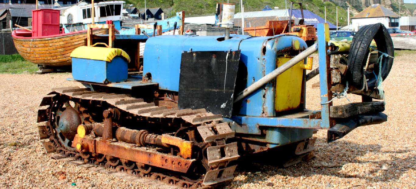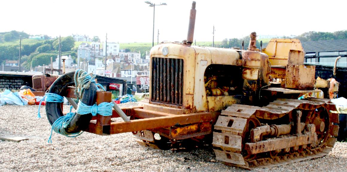 TRACTIVE POWER - Apart from the odd trailer for smaller day boats, most of the bigger MFVs use old earth moving machinery, like this Caterpillar diesel, to push their vessels into the English Channel, but then there is the recovery method and for this a bulldozer is not well suited, though they do seem to cope with the rust of regular immersion in salt water. Please do not climb on this machinery unsupervised. If you are very careful and have soft sole shoes, a kind fisherman might let you inspect his mechanical shovel and even tell you a tale or two - but please ask an adult. Copyright © May 29 2016, all rights reserved. You will need permission from Bluebird Marine Systems Ltd to reproduce this photograph, except for personal study or educational purposes, when a credit would be most welcome.