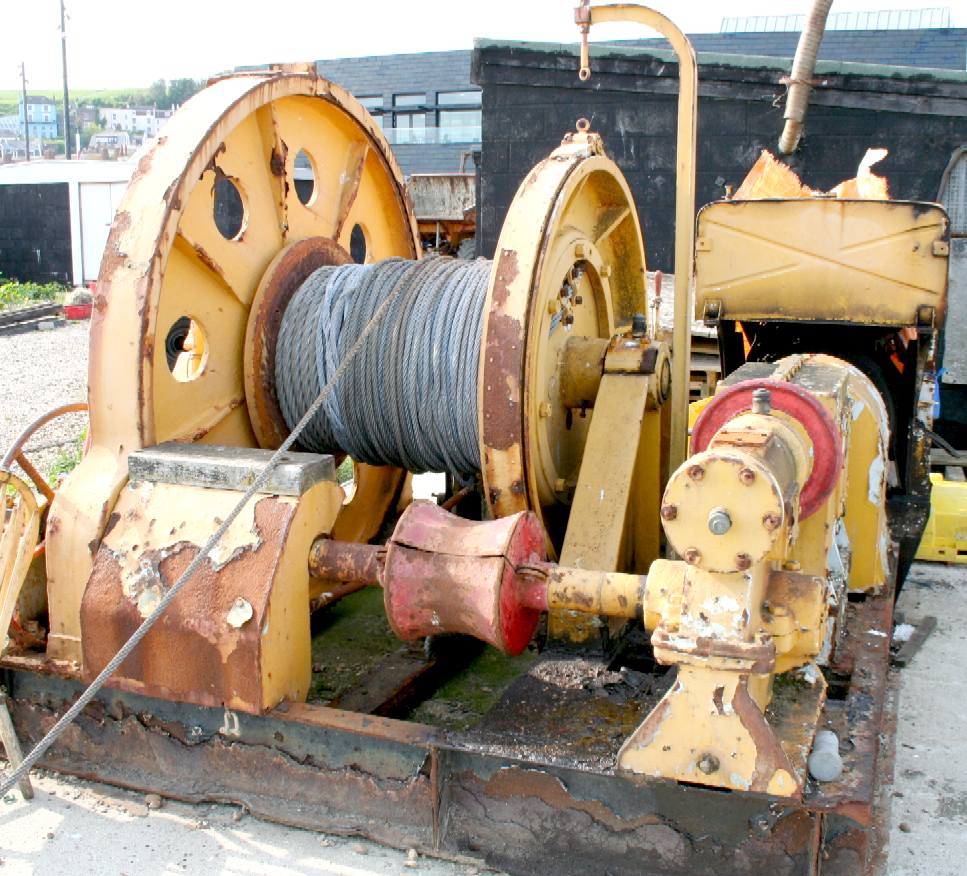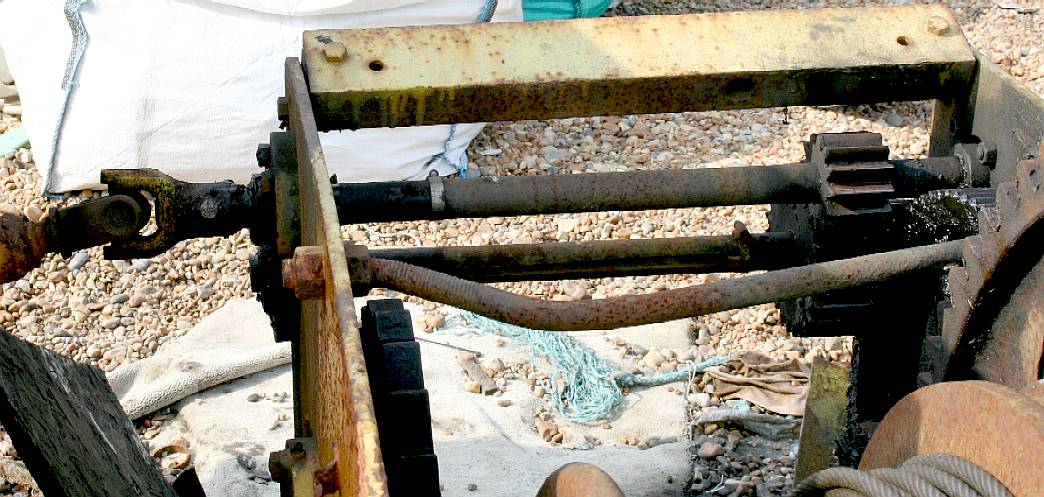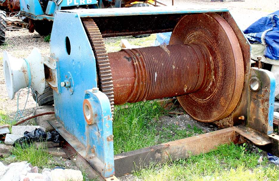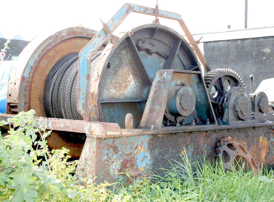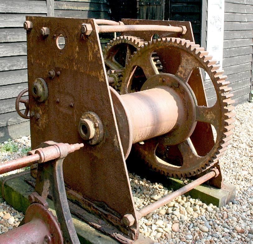WINCH & CABLE - This is one of the winches used by fishermen at Hasting to recover their boats. The heavy duty winch is powered by a diesel engine and protected by a shed when it is not in use. Note the drum carrying the steel Bowden cable and the gearbox attached to the motor, providing the first stage of reduction gearing.