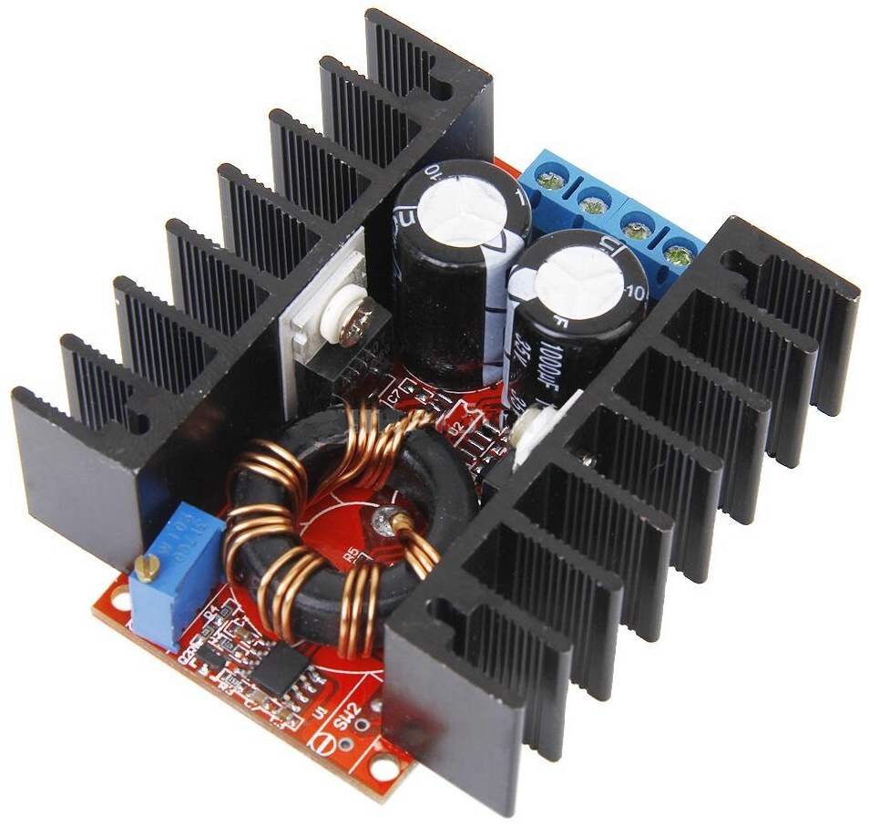 SOLAR PANEL CHARGE REGULATORS & DC to DC CONVERTERS - The above is a selection of electronic controllers that will ensure your battery is charged correctly by your solar panels. The lower right is a DC to DC converter to boost voltage should that be needed.